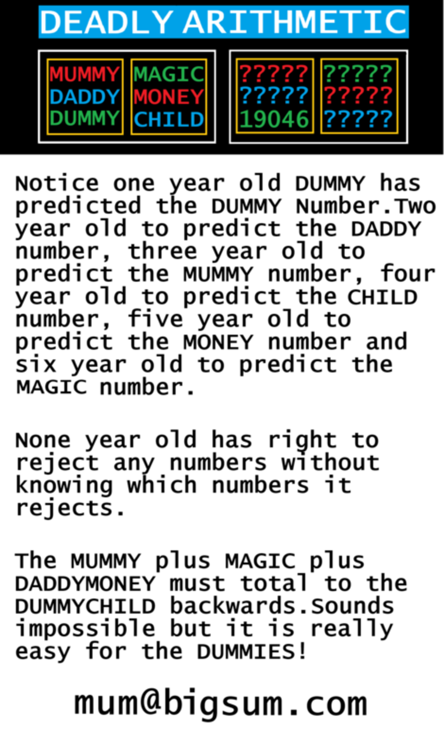 HUH? IT IS DEADLY EASY FOR NONE YEAR OLD AND NINE YEAR OLD DUMMIES TO MANIPULATE UNKNOWN NUMBERS TO CREATE VERY BIG SUMS THAT DO ADD ACROSS AND DOWN TO TOTALS BACKWARDS WITH SMART STATE QUEENSLAND DEADLY DANGEROUS MENTAL ORITHMETIC DUM SUM CUBES!